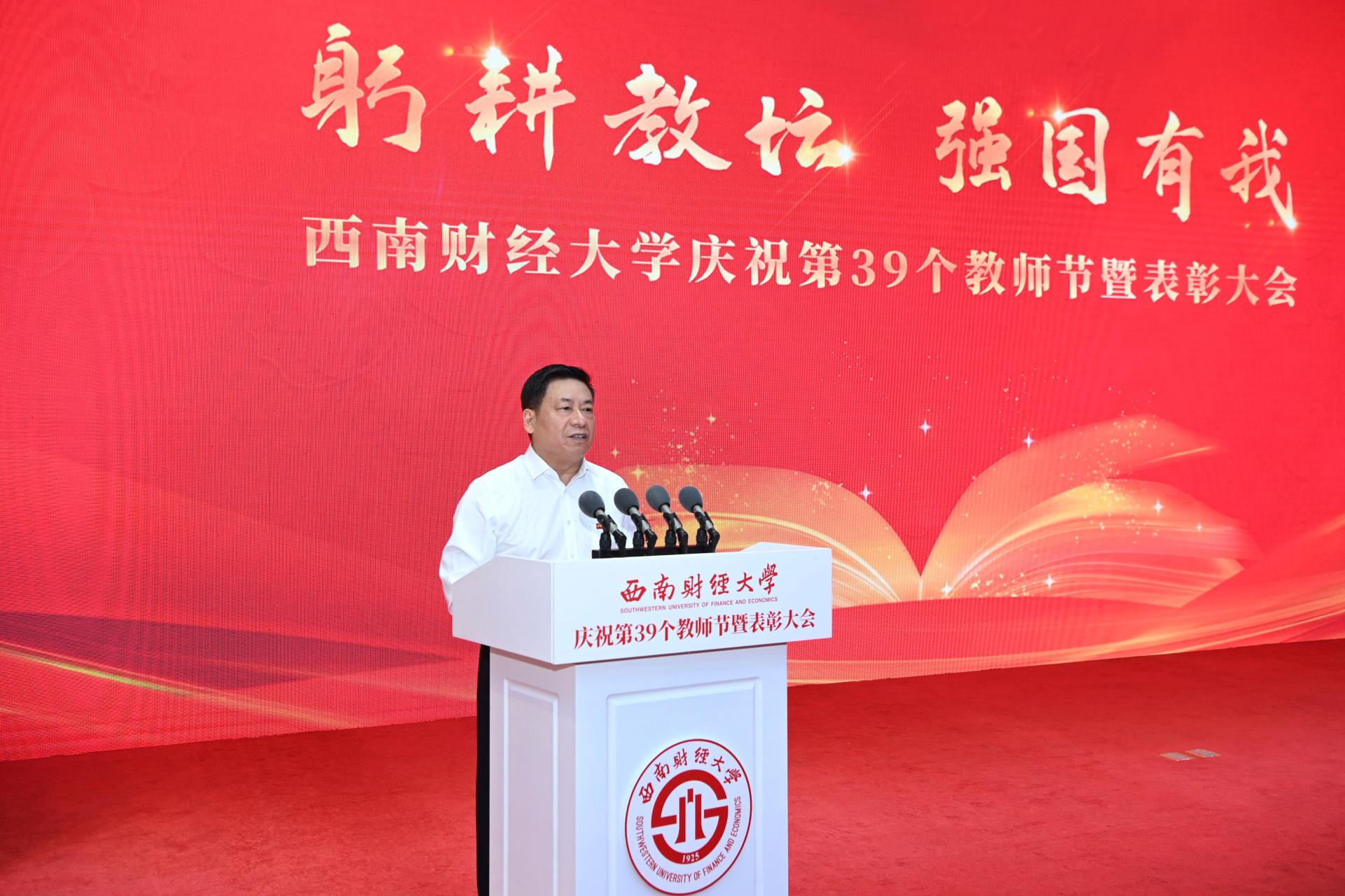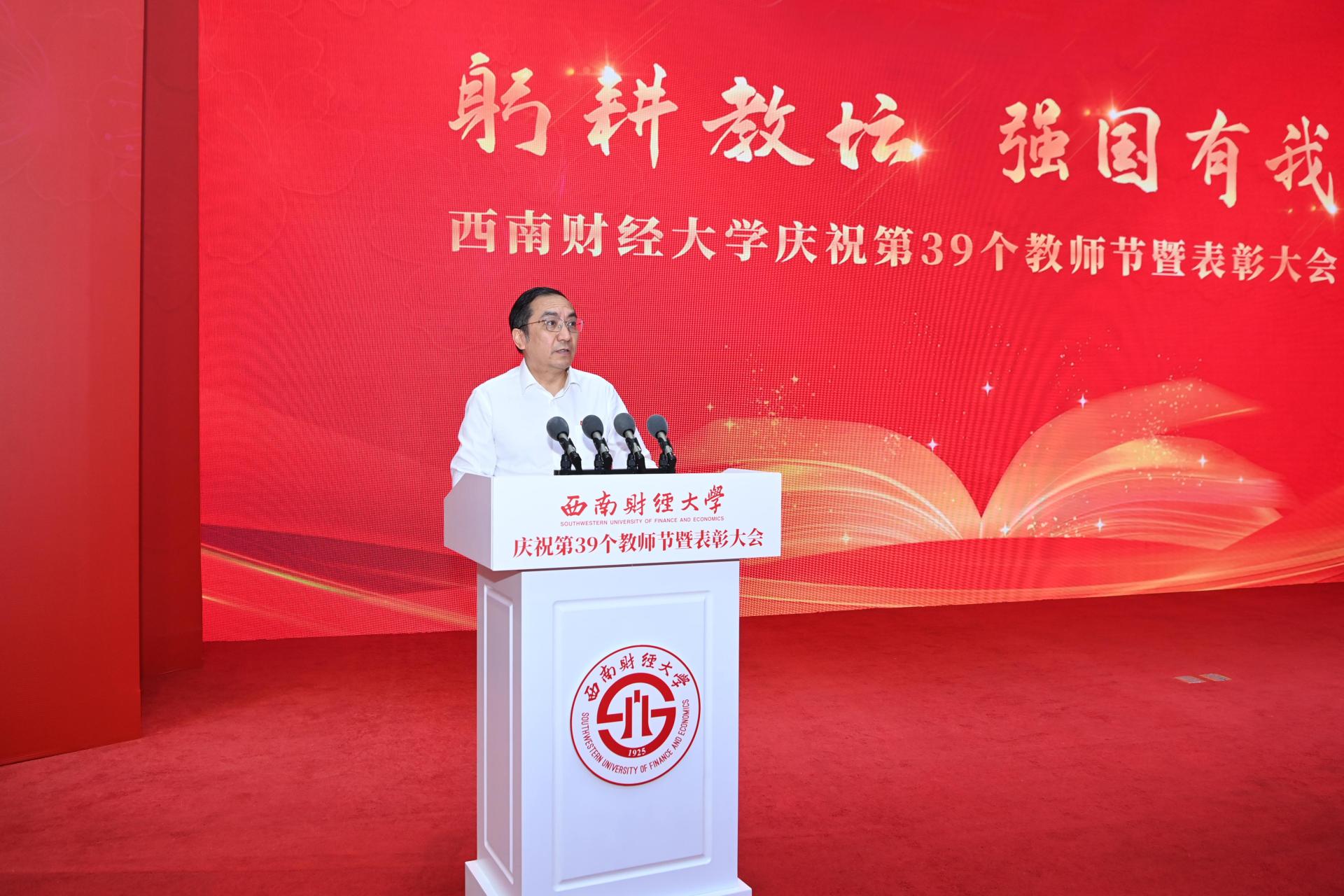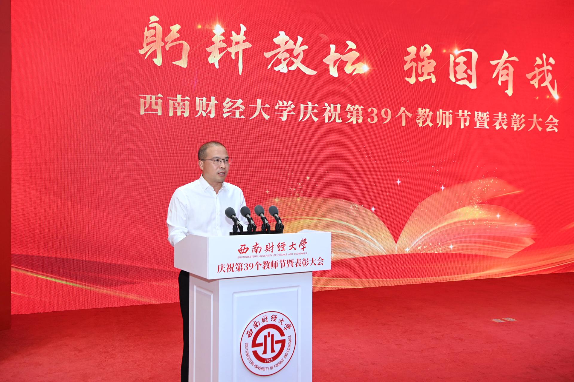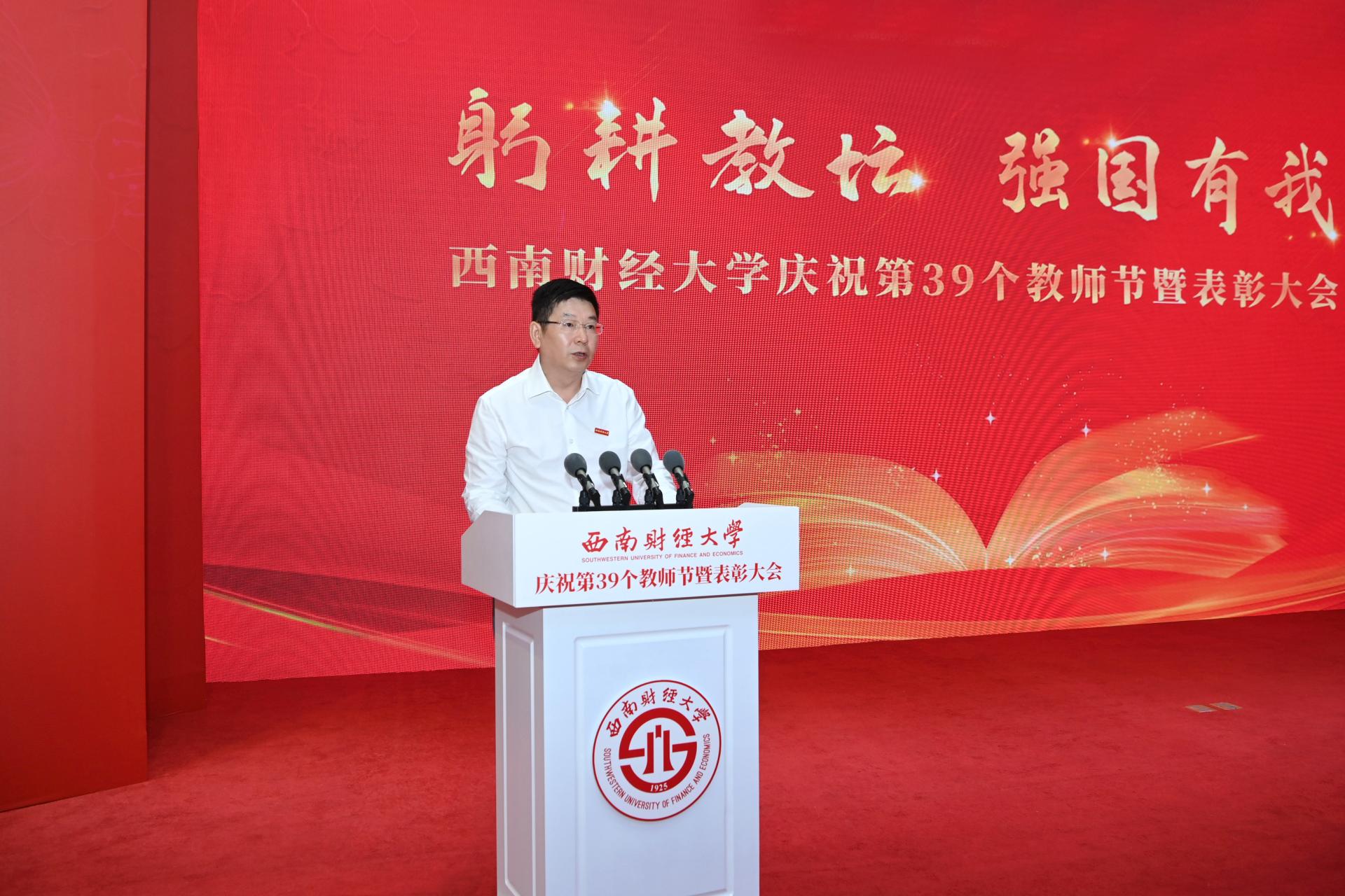 立德树人育桃李,躬耕教坛担使命。9月10日下午,西南财经大学在弘远楼105会议室隆重举行庆祝第39个教师节暨表彰大会。党委书记赵德武,党委副书记、校长李永强,党委副书记、纪委书记孙殿明,党委常委、副校长尹庆双、史代敏、桂富强、李志生,荣休教师和从教30年教职工代表,获奖集体和个人代表,职能教辅部门、学院(研究院)代表,统战成员代表,外籍、港澳台教师代表,离退休教职工及新入职教职工代表参加大会。李永强主持大会。