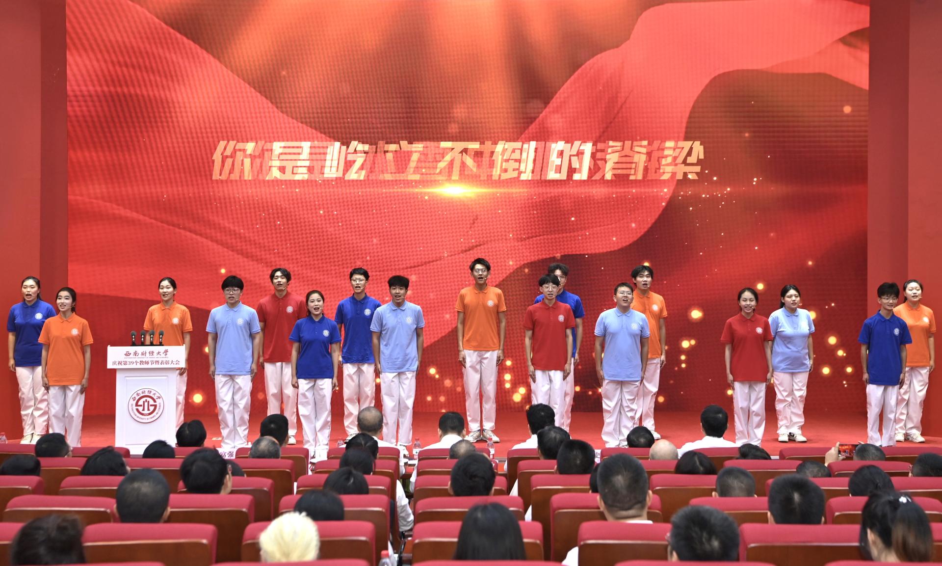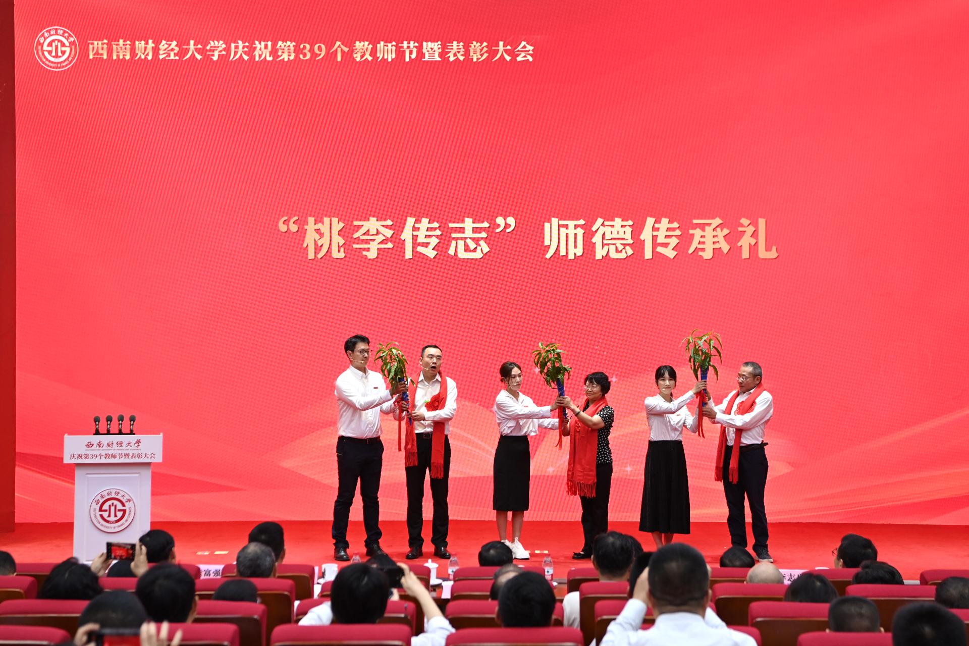 为传承红色基因,弘扬西财精神,大会还特别举行了“桃李传志”师德传承礼,荣休教师代表解春侠、从教30年教师代表余海宗、黄大年式教师团队负责人马永强分享了各自立足自身岗位,乐于奉献、奋力拼搏的经历和感悟,讲述了各自见证的西财变迁、岁月如歌,并表示愿倾尽全力,为百年树人大计贡献力量,也期待后生群起,薪火相传,书写西财人教育报国新篇章。新入职教师代表刘佳怡、林燕玲、张阳表示将传承前辈们的优良传统,永葆教育初心使命,以满腔的热爱和不懈的奋斗来躬耕教坛,为谱写中国式现代化教育西财篇章贡献自己的力量。