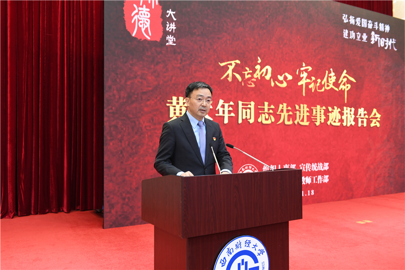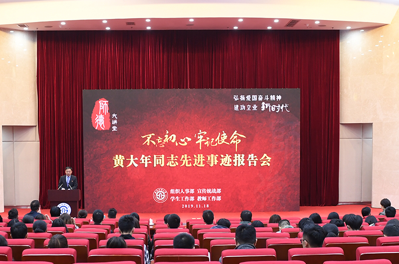 11月18日,全国“时代楷模”黄大年同志先进事迹报告会在柳林校区弘远楼105会议厅举行。此次报告会是学校“不忘初心、牢记使命”主题教育的重要内容,也是学校“师德大讲堂”的首场讲座。学校党委副书记马骁,学校师德建设委员会成员单位相关负责同志,部分学院分党委书记、师生党支部书记及师生代表近400人参加了报告会。